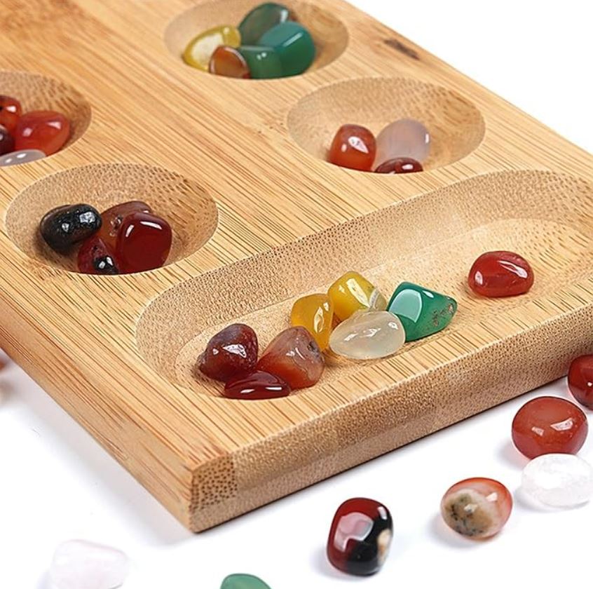 If you ever stumbled upon a board like the one in the photo, with two rows of small pits filled with colorful glass stones, you might’ve just found yourself a classic game called Mancala. Known for its simple setup yet strategic depth, Mancala is a game that has traveled across continents and centuries, bringing people together through competitive and often meditative play. Let’s take a journey through this timeless game, from its origins to its rules, and explore why it’s still loved today.
