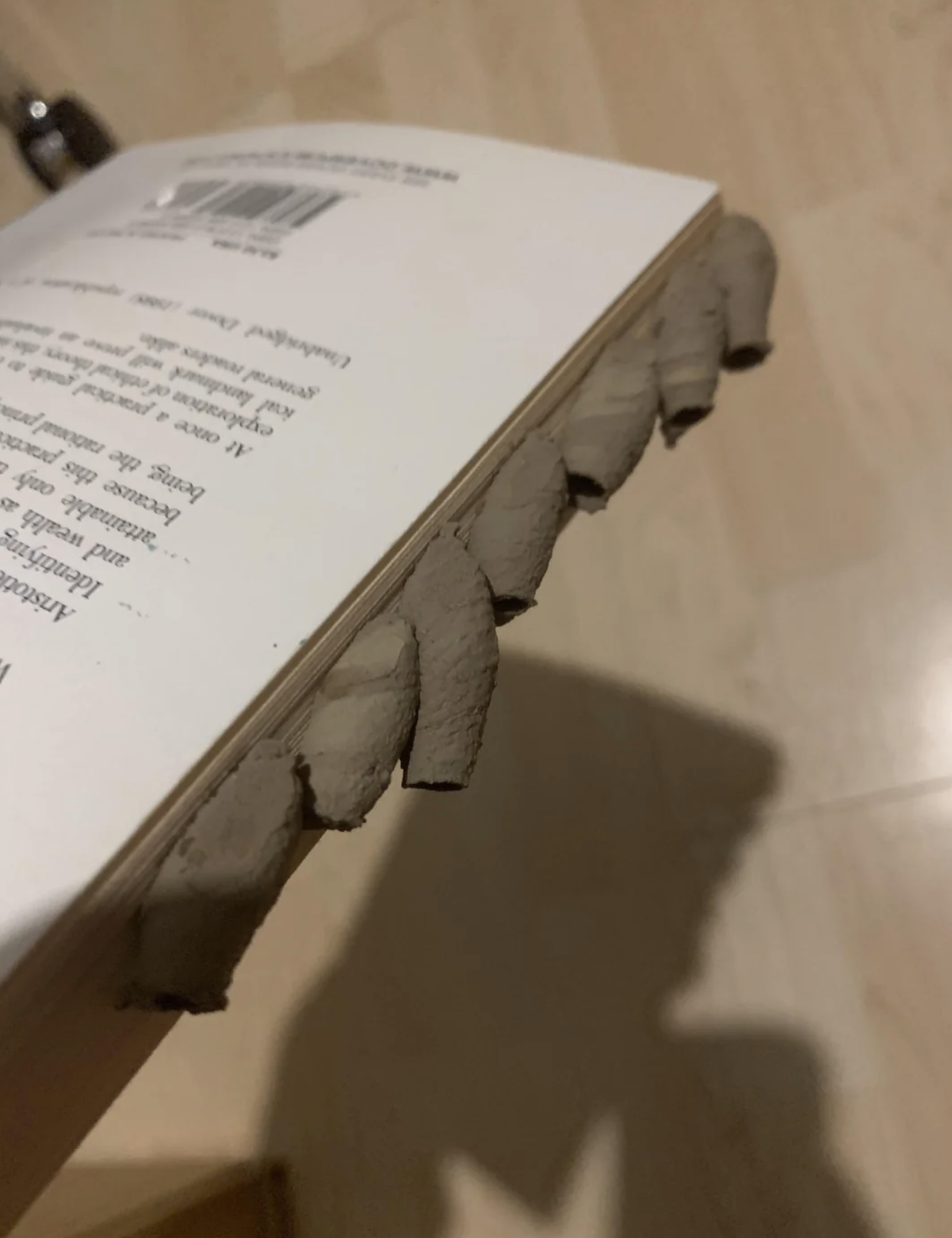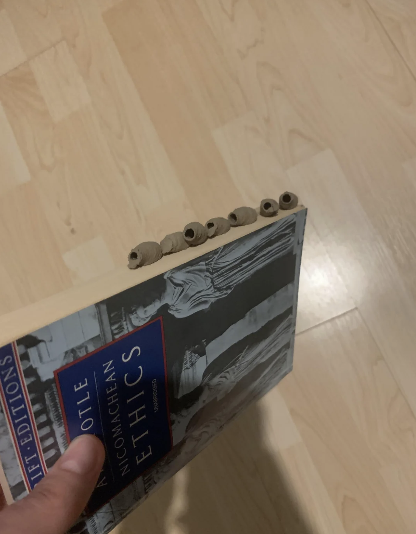 A recently forgotten Nicomachean Ethics book had a nice surprise: a row of orderly mud dauber nests attached to its spine. The book had been leaning against a wall, making it the perfect place for the wasps to nest and create mud dauber wasp nests.
