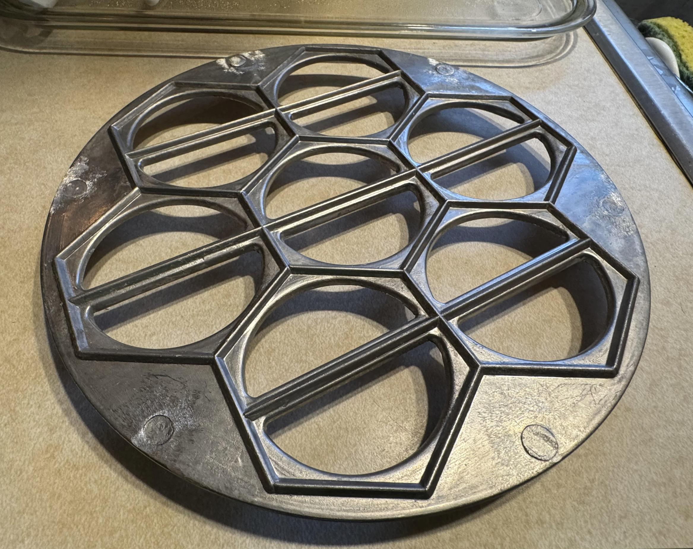 This one had me stumped for a minute. A flat, round aluminum plate with little hexagonal cutouts—what could it be? Turns out, it’s a ravioli or pierogi maker. You dust it with flour, lay down a sheet of dough, add your filling, then press a second layer of dough on top. Rolling a pin across seals everything together and cuts out perfectly uniform pieces. Such forgotten kitchen tools make you wonder how often people made these dishes from scratch.