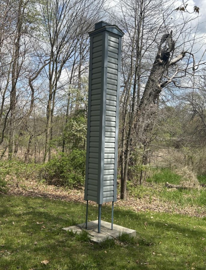 The tower pictured sits quietly in a serene lawn with nearby trees and open grassland. Such surroundings seem fitting. Since Chimney Swifts feed airborne, they need ample airspace for hunting and they fly frequently. They do not need elaborate gardens. What they require are accessible areas of refuge from predators, safety from inclement weather and a willingness from neighbors to patiently tolerate their presence.