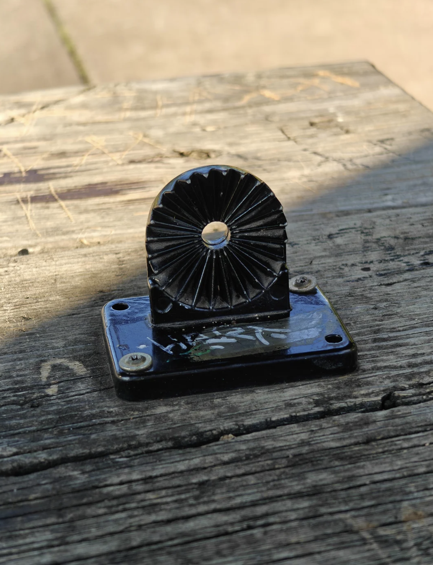At many parks or skate spots, you’ll see a small black metal bracket below a wooden picnic table or bench. It’s a little gadget with a ridged arc like a gear and a hole in the middle. Many assume it’s a sundial or a cigarette holder, but essentially it’s an adjustable flagpole holder or some other type of bracket holder that adjusts to different angles.