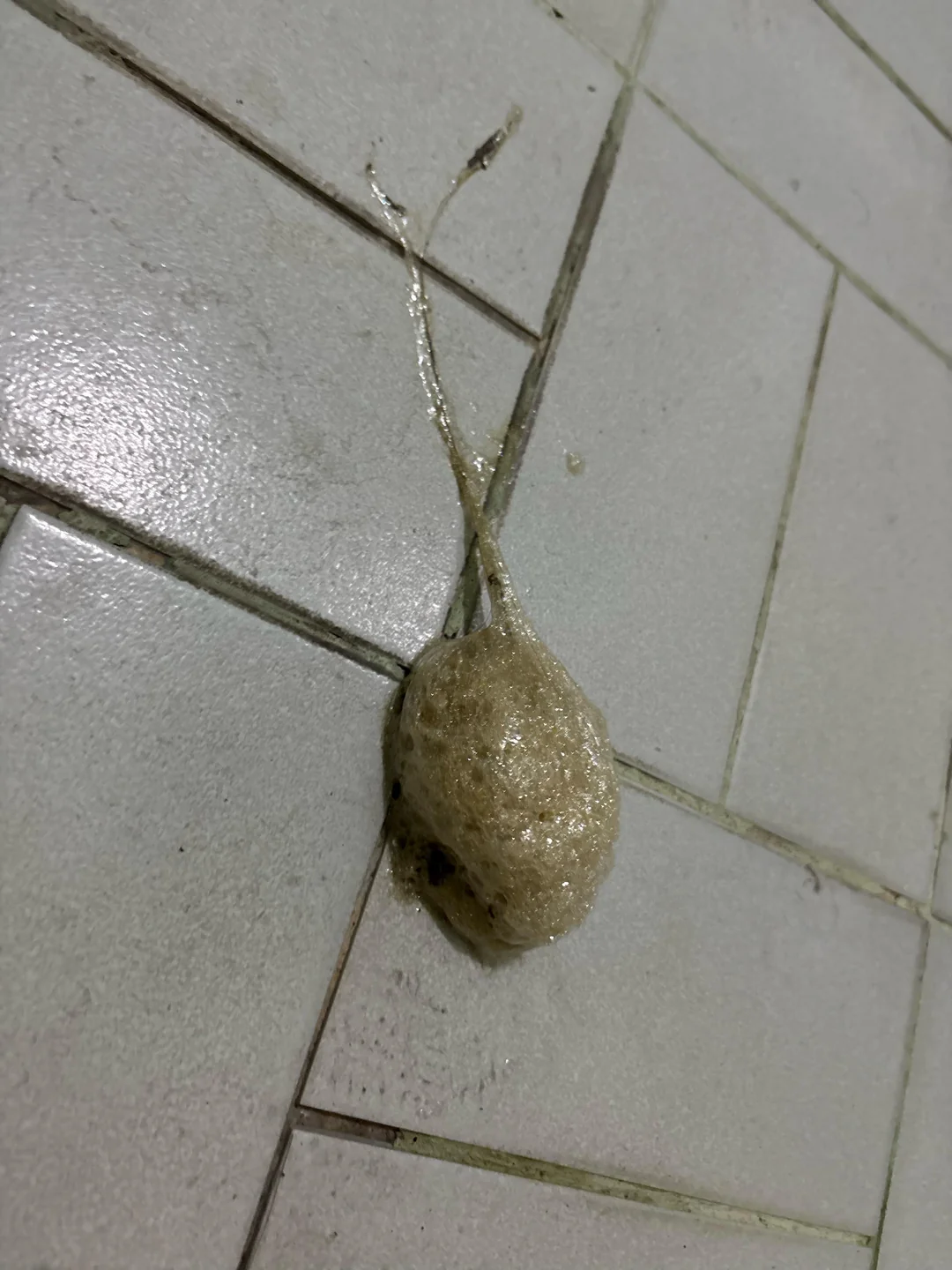 Many frog species and most tropical/subtropical frogs will foam nest as a way to protect their eggs from predator attack, heat, desiccation, and other perils. Foam nests are often created when a frog (or toad) makes mucus secretions, then a male frog mates, and in a process called amplexus (the mating embrace), the female whip washes the mucus with her hind legs. The result is a stable and airy mass that may stick to leaves, surfaces, or, in this case, tiles.