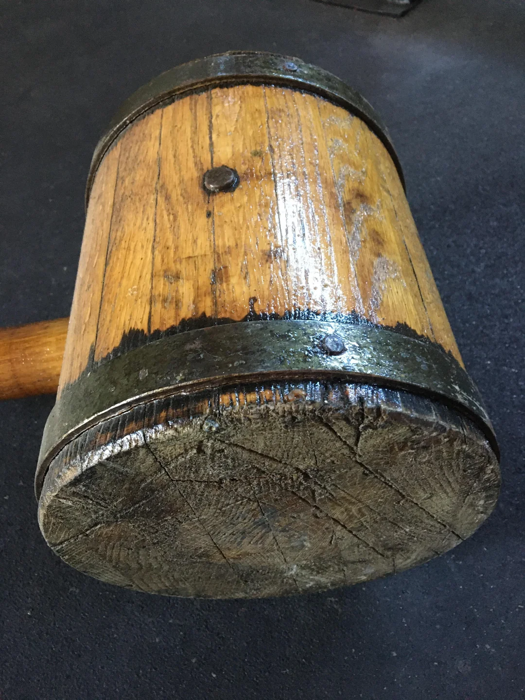 Besides being a useful tool, this tool reflects the archetypal “test your strength” hammers that one may see at fairs where there is a lever to strike in order to push a weight and ring a bell. It’s possible that a maul like this could have served dual purposes: People of all ages have use them in their daily activities to work and for leisure. This maul, made of wood and built sturdy for a large heavy duty tool, is perfect for the hard work that was done in prior eras of heavy manual labor before the use of machinery.
