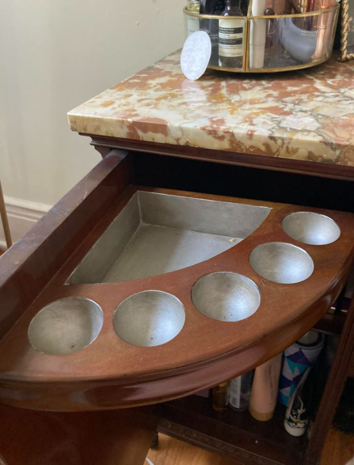 And now, imagine finding one of those vanities in perfect condition, with a hidden surprise: small metal cups embedded in the drawer. Anyone who has ever wondered what those odd little compartments were for, let’s take a trip down memory lane and find out what these were for.