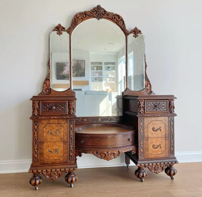 Did you ever see your grandmother’s vanity in the corner of her bedroom with all of her perfume bottles and her hairbrushes laid out like treasures? Perhaps you remember how she’d sit with a little bit of powder on her nose before leaving for the day. Or perhaps you’d sneak into her room just to play with the things inside of it, imagining yourself all grown up. The vanities, with their endless designs and separate compartments were bigger than just pieces of furniture. They were each a path to another time, another mind set.