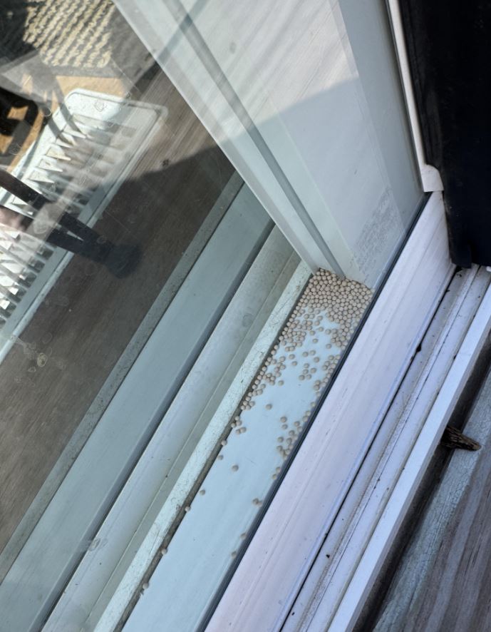 Typically, in a well-functioning insulated glass unit, the desiccant Beads remain confined within the edge spacer. Over time, however, the seals around windows will eventually degrade. They shrink, break apart or fail completely. Small openings develop. When a failure occurs in the spacer or when a seal breaks down, the Beads can become dislodged and fall into the track below the glass unit. This may be what occurred in the photo above. The Beads seem to be collecting along the bottom portion of both the frame and the glass, which is consistent with where free floating materials tend to accumulate.