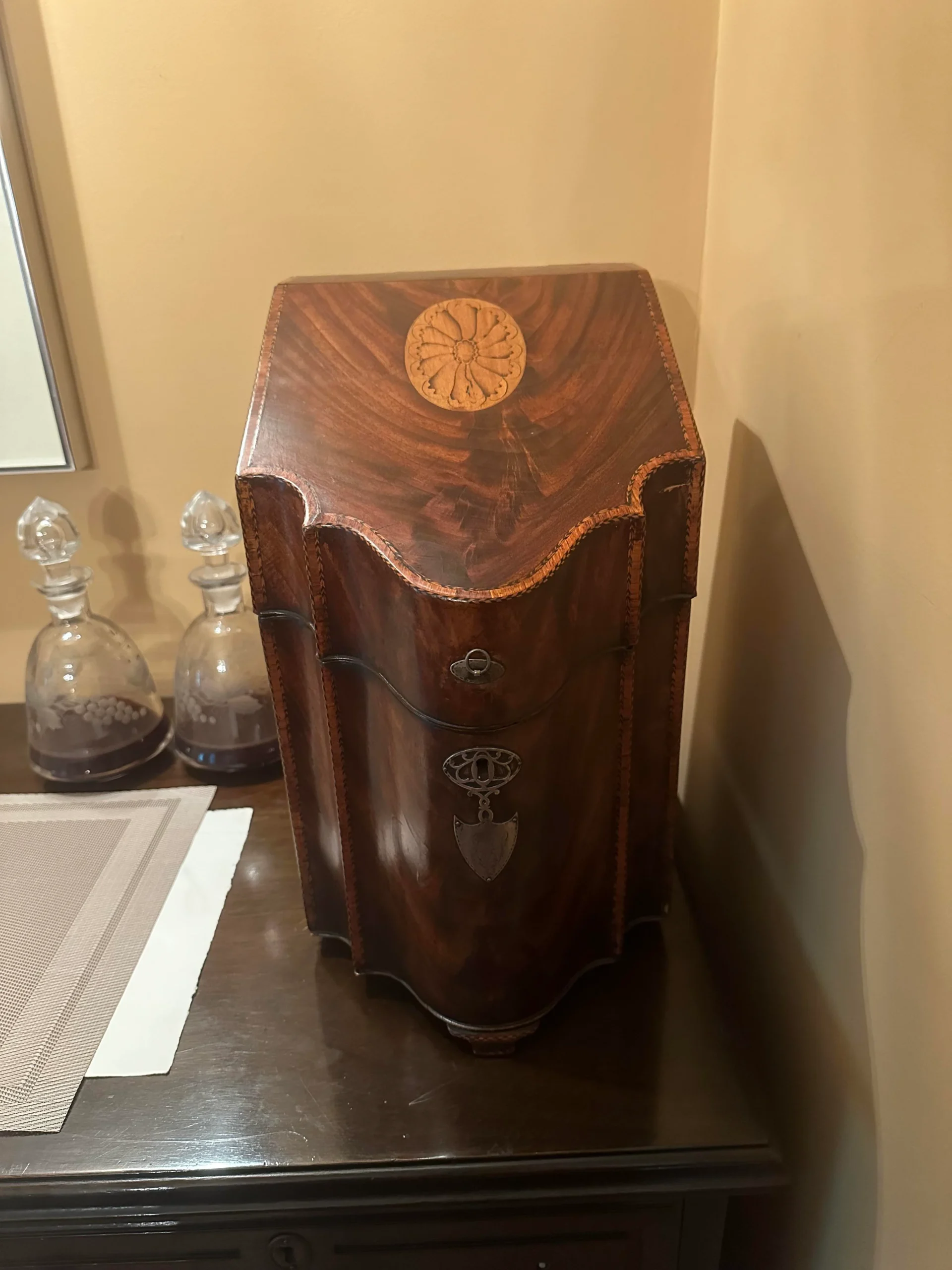 The particular piece of furniture is an antique wooden chest and it is popularly known as a knife box. These beautiful and sometimes complex shaped containers have been used in the eighteenth and nineteenth centuries for the purpose of storage and display of cutlery with a special emphasis on knives as these items were considered precious possessions in a home.