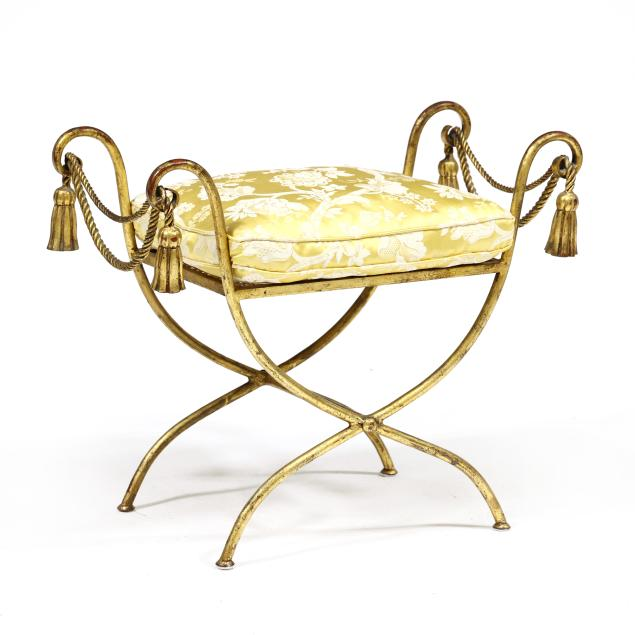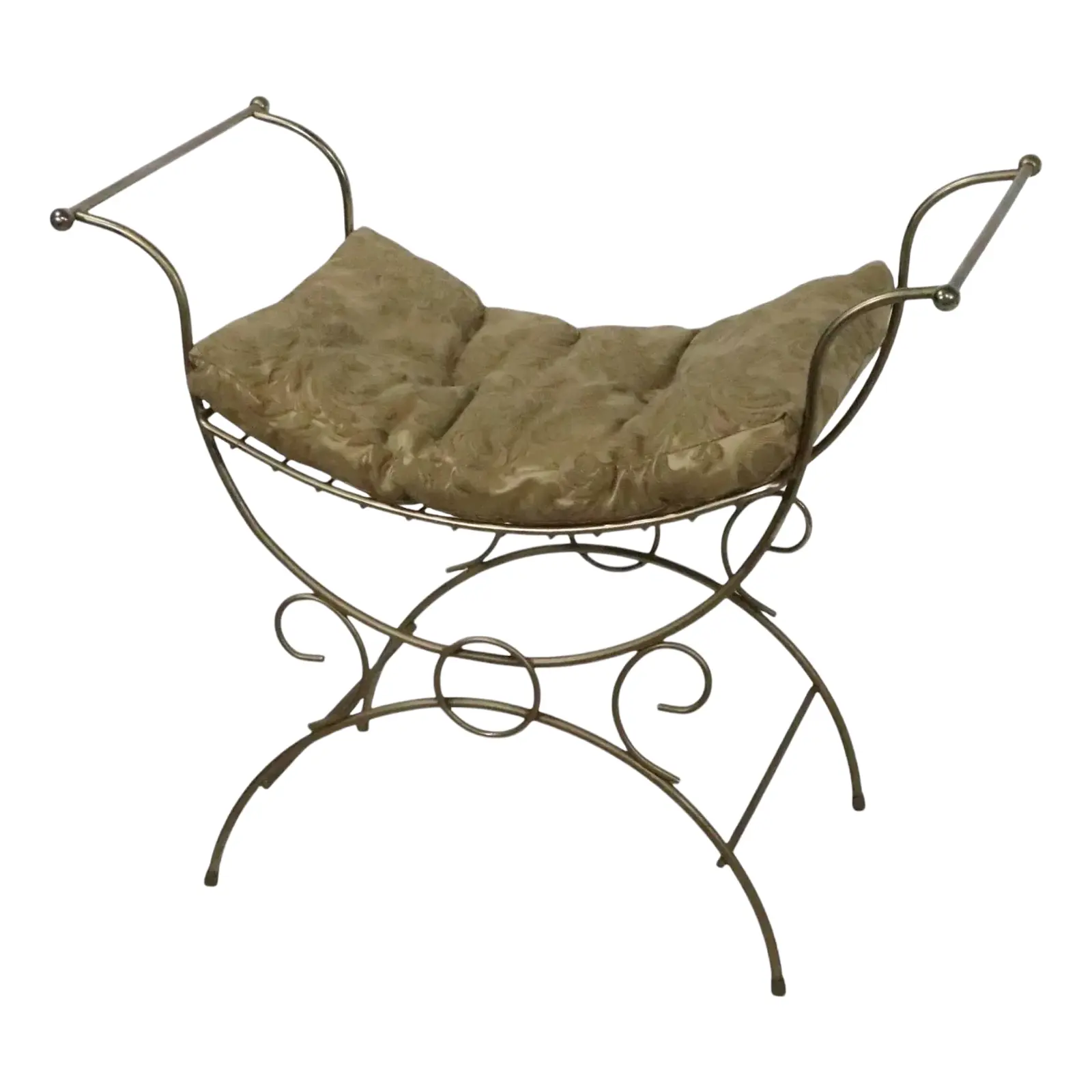 At first glance, what may appear to be a small, odd-looking chair, could very possibly be something much more visually appealing. Depending on its shape, the metal work, and the over-all design, this piece is most likely a Mid 20th Century Hollywood Regency vanity garden bench. That may seem to be a lot of big words, but once you get past the wear and tear and take a closer look at the details, it will make perfect sense.