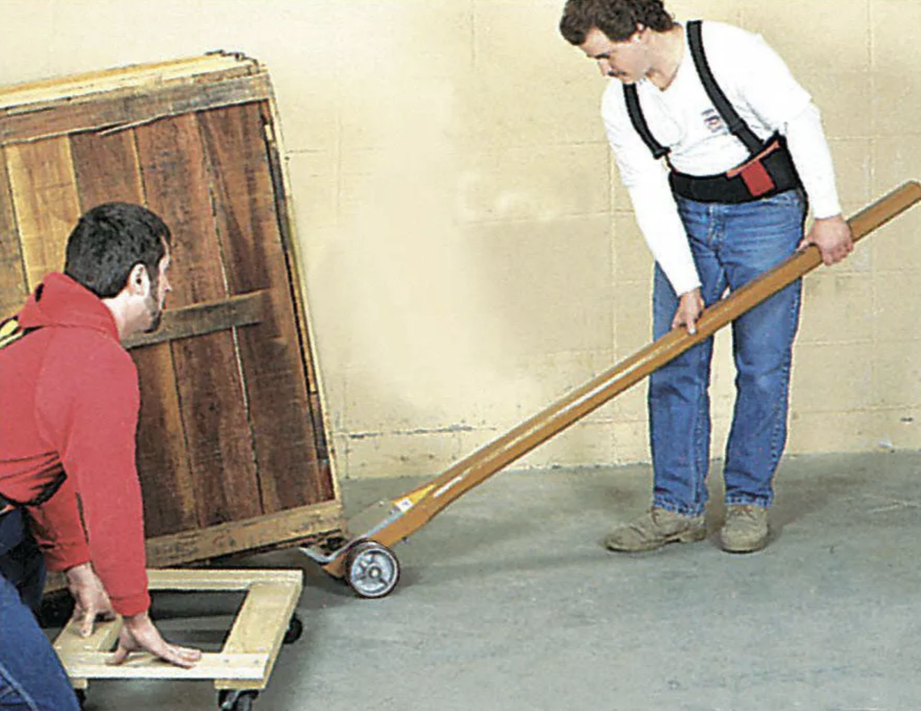 Workers would slide the footplate of the dolly under a 1,000-pound crate, pull back on the handle of the dolly, and create enough lift to slide a dolly under the crate. This greatly reduced the time and labor it took to move awkwardly shaped heavy items.