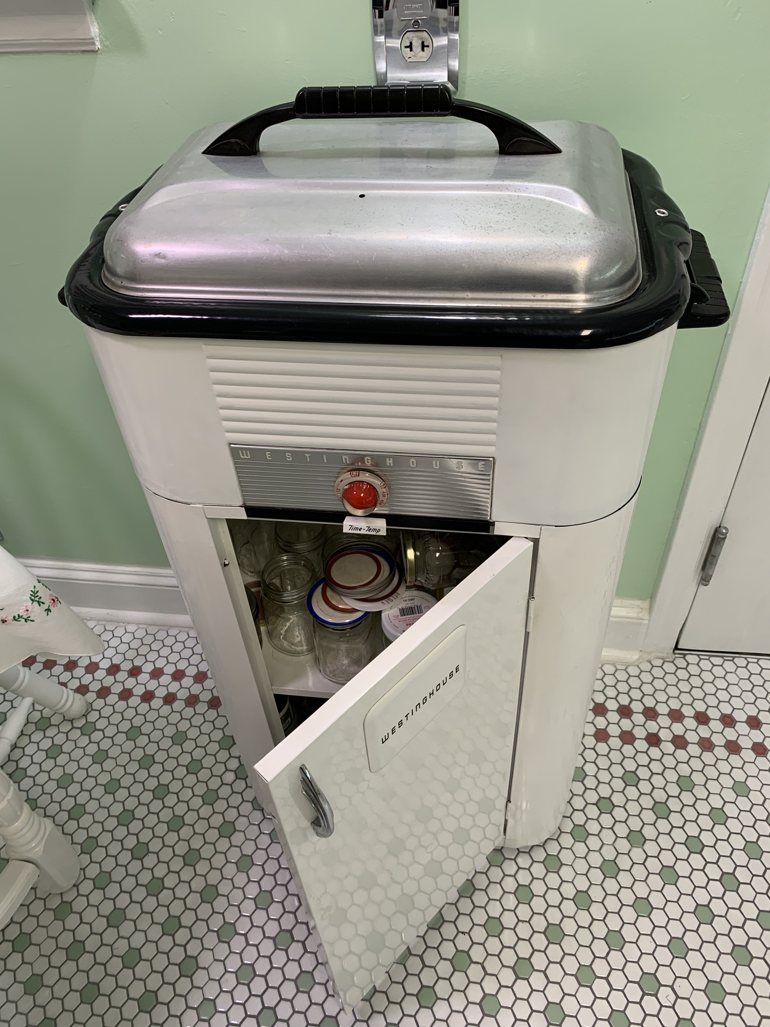 This particular model, they explained, came with its own storage stand, which doubles as a place to keep canning supplies when not in use. Once a staple of the American kitchen, the roaster-oven has seemingly faded into obscurity, as the owner noted: “Tho’ once ubiquitous in the typical American kitchen, based on your comments & questions, these seem to be an all-but-forgotten item today.”