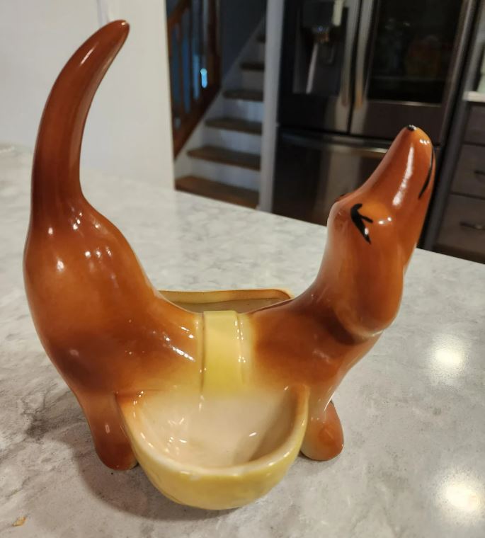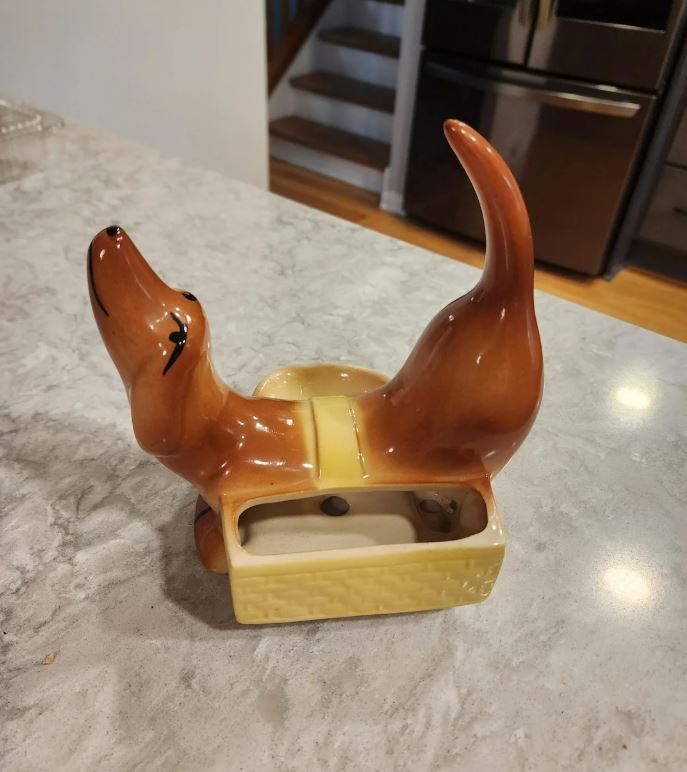 They were practical organisers that also served as joyful works of art. Some were dog or cat shaped, while others had cartoon faces or mid-century modern patterns. The one here, modeled after a dachshund, has two built-in compartments: a square slot for a wallet and a curvy nook for keys, cuff links, or coins.