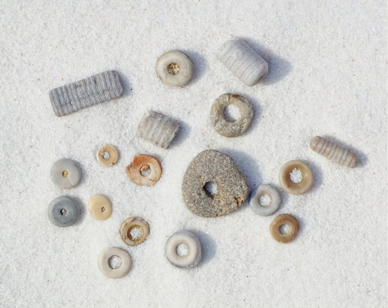 The cylindrical segments, often mistaken for tiny beads or screws, are actually fossilized pieces of crinoid stems. These stems supported the crinoid’s delicate, feathery arms that filtered food from the water. The segmented nature of crinoid stems allowed flexibility, helping them sway with ocean currents. Each disc-like segment, sometimes called a “columnal,” was stacked to create a stalk anchored to the seafloor or sometimes even free-floating.