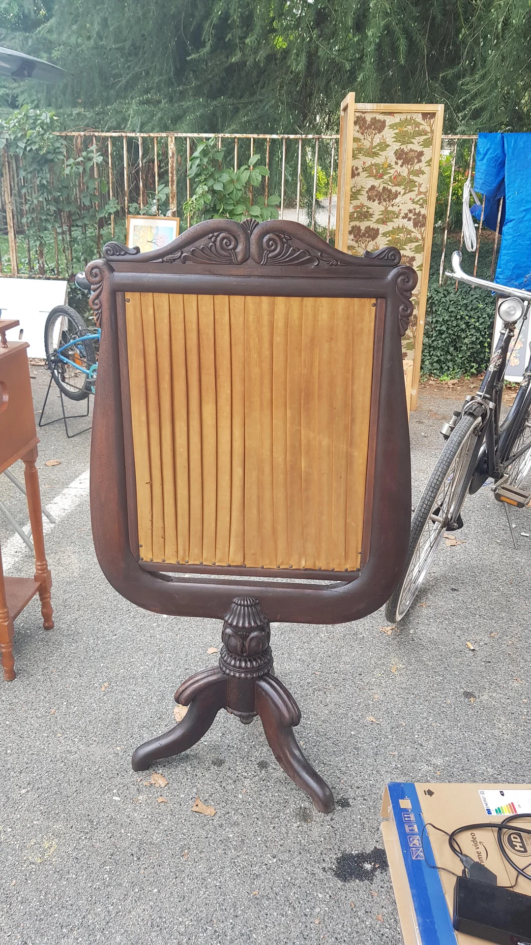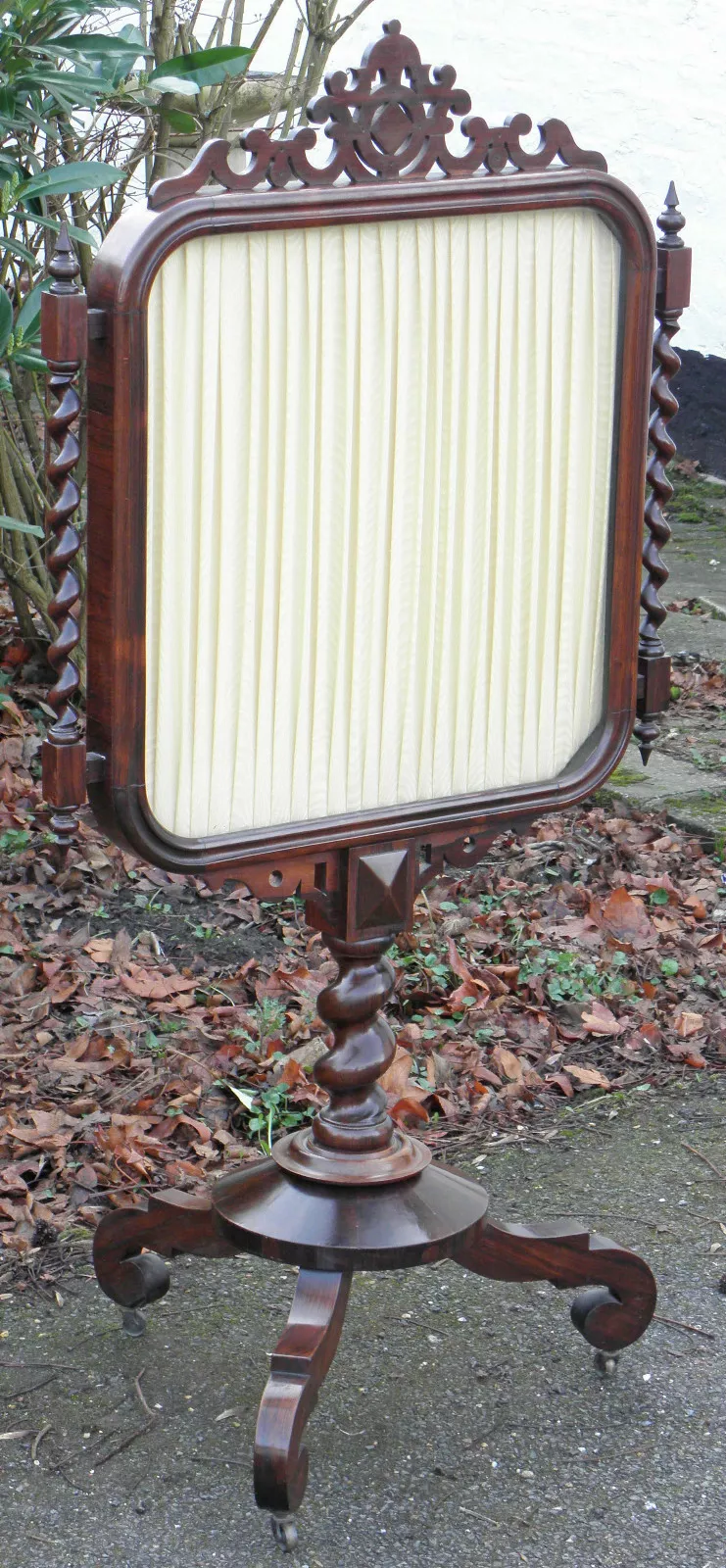 This specific fireplace screen, such as this one being sold on eBay, has a wooden frame and striped fabric panels. These vertical stripes in sometimes pale, often rich colors were a typical of the era and lent elegance. The wood frame — probably mahogany or walnut — would have been hand-carved with some of the flourishes that appealed to consumers in the late 1800s.