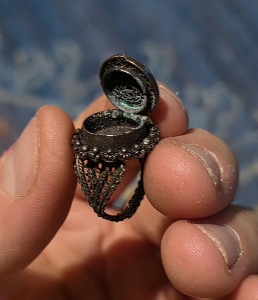 In a world before deodorant, sewer systems and hand sanitizer, people found inventive ways to stay fresh — and survive. One of the more peculiar artifacts from the past is what’s known as a vinaigrette ring. A minute and decorative piece of jewelry that was so much more than fashionable. A recent Reddit post has resurfaced the antique oddity, when a user posted pictures of a mysterious copper. Looking ring that their girlfriend found. Its hallow chamber, intricate detailing and mysterious markings had comments buzzing — and for good reason.