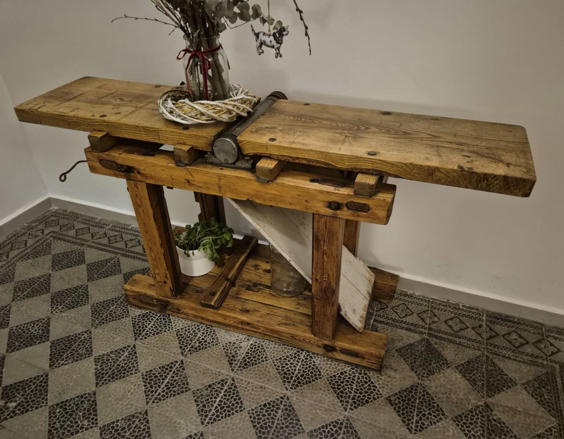 I am a sucker for old tools that look like they would be able to withstand a tornado. When I came into an apartment building hallway and spotted a rugged console table that had a large metal cylinder in the middle of it, I stood still. That was no generic table from the local vintage store. It was more than likely a repurposed antique wood jointer table. This was a woodworking jointer made decades ago that someone decided to turn into a decorative piece of furniture.