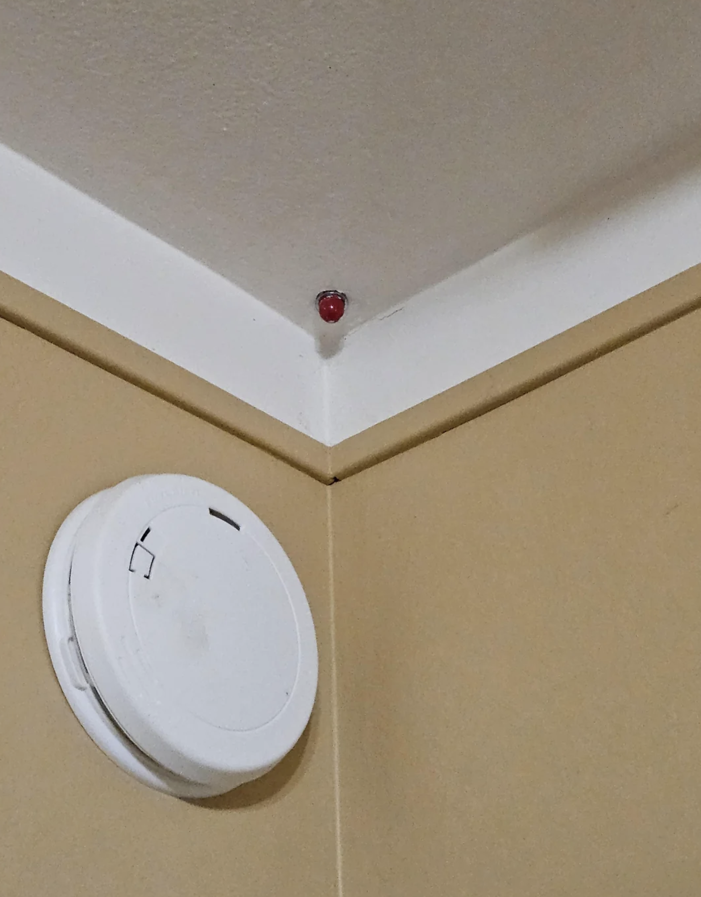 You may see a small red dome hanging in the corner of your ceiling. This is probably a “beehive phone light,” not a fire alarm, nor a camera; but rather a piece of old technology. A long time ago, phones were mainly connected via wires (landlines). Those who were deaf and/or hearing impaired needed a way to let them know when someone called them.