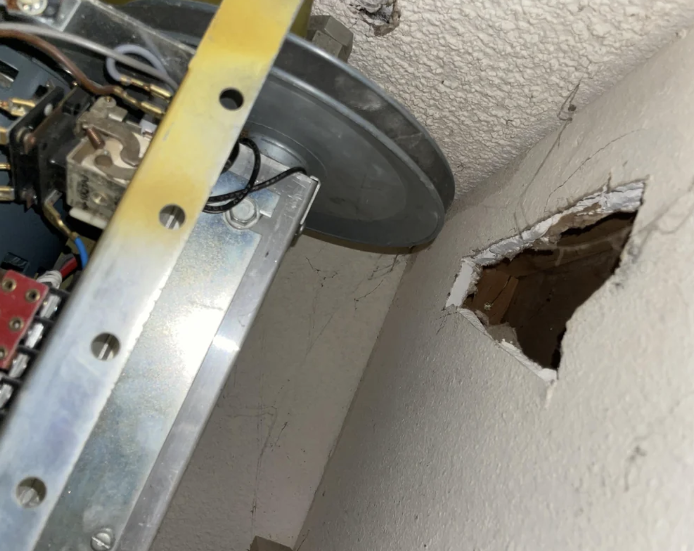 While going through the attic, I noticed something strange behind the drywall. It kind of looked like a fan motor and an old electrical panel mixed together. There was a red bulb that said “MEDIUM”, a belt-driven thing, and a pile of old wiring. It was dusty, of course, and was obviously silent from not seeing the light of day for years! It turned out to be a Montgomery Ward garage opener.