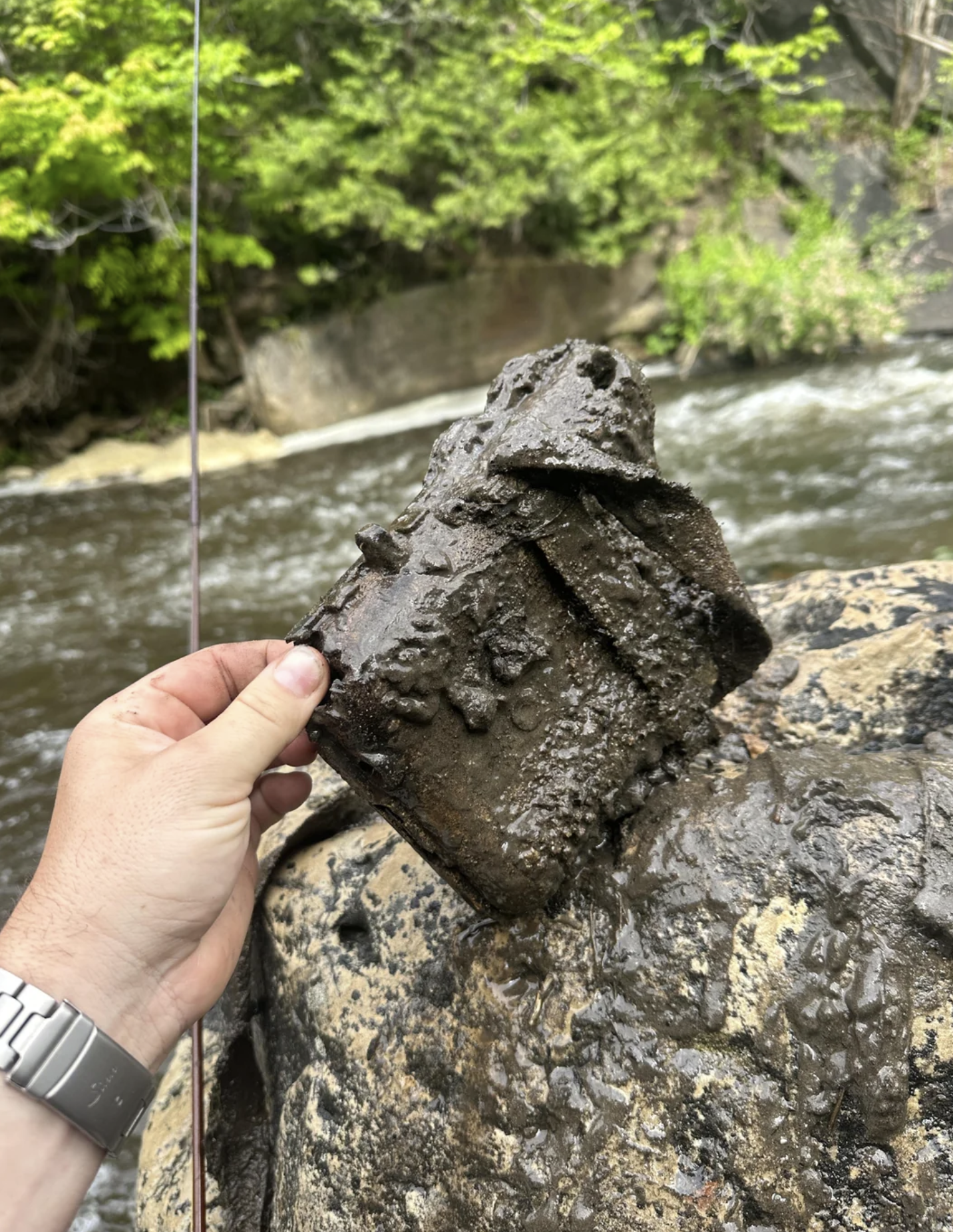 It looked at first like a twisted up chunk of a radio or control unit. However, as I cleaned off layer after layer of dirt from the river, I could see features I recognized from trail cameras — three little green buttons, a small screen (display), and the sturdy outer shell of a trail cam.