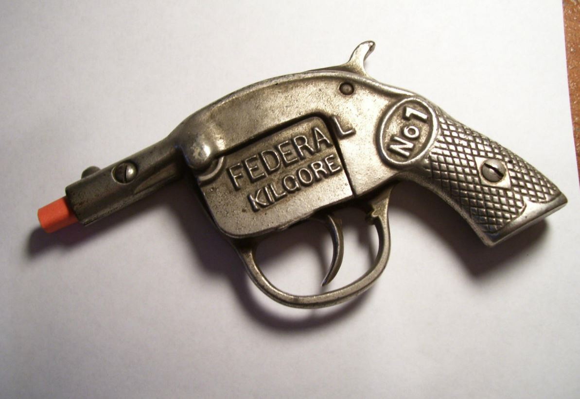 The Federal Kilgore cap gun made by the Kilgore Manufacturing Company was one of the favorite toys for children in the mid-twentieth century. Made with the utmost detail, these cap guns were made from die-cast metal and were shaped like the real revolvers used by cowboy heroes in the movies. It had a compartment where small rolls of caps could be inserted, when fired, it shot out with a bang and a puff of smoke, replicating the use of a real gun without the risk.