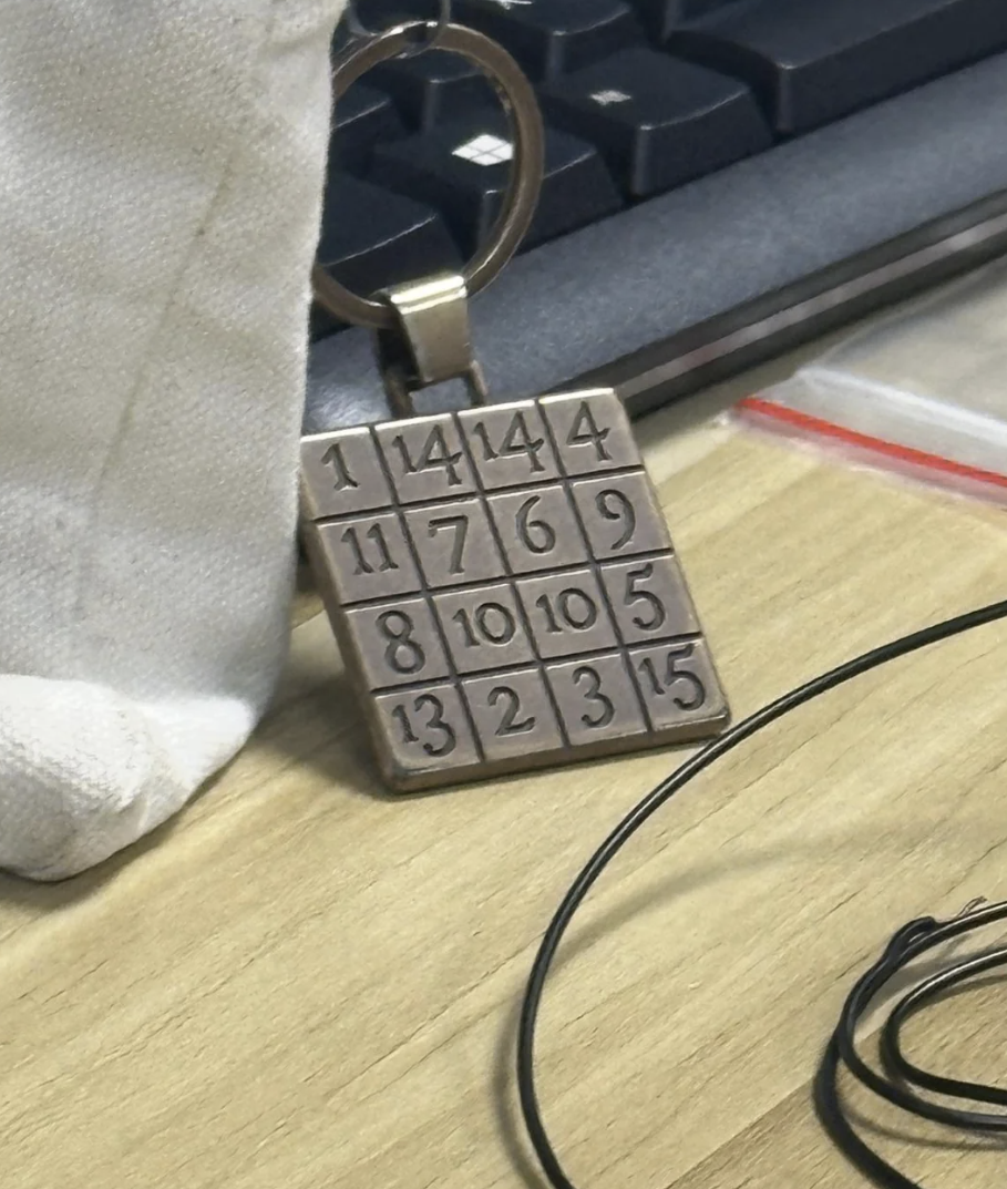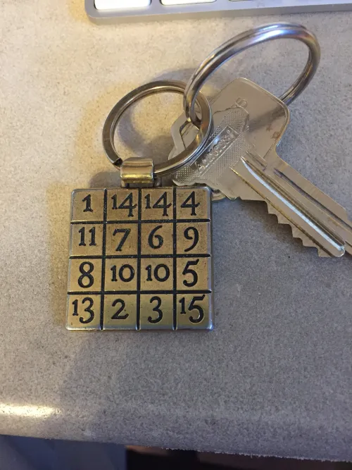 The magic square became widely known during the Renaissance. Most prominently, in Albrecht Dürer’s 1514 engraving Melencolia I, which hosts a magic square in its background. Many modern squares, including this keychain, mimic that layout while replacing Dürer’s magic constant of 34 with 33.