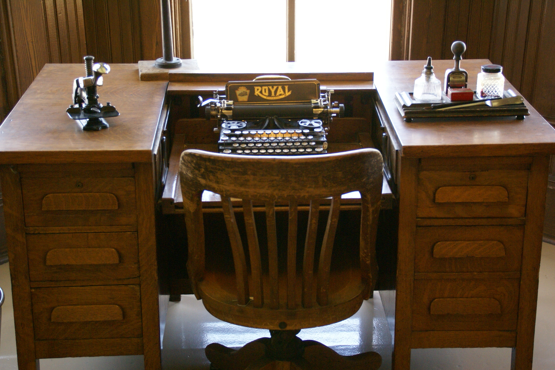 This arrangement enabled the workers to switch from type-writing to paper quickly, saving time and keeping the desk neat.