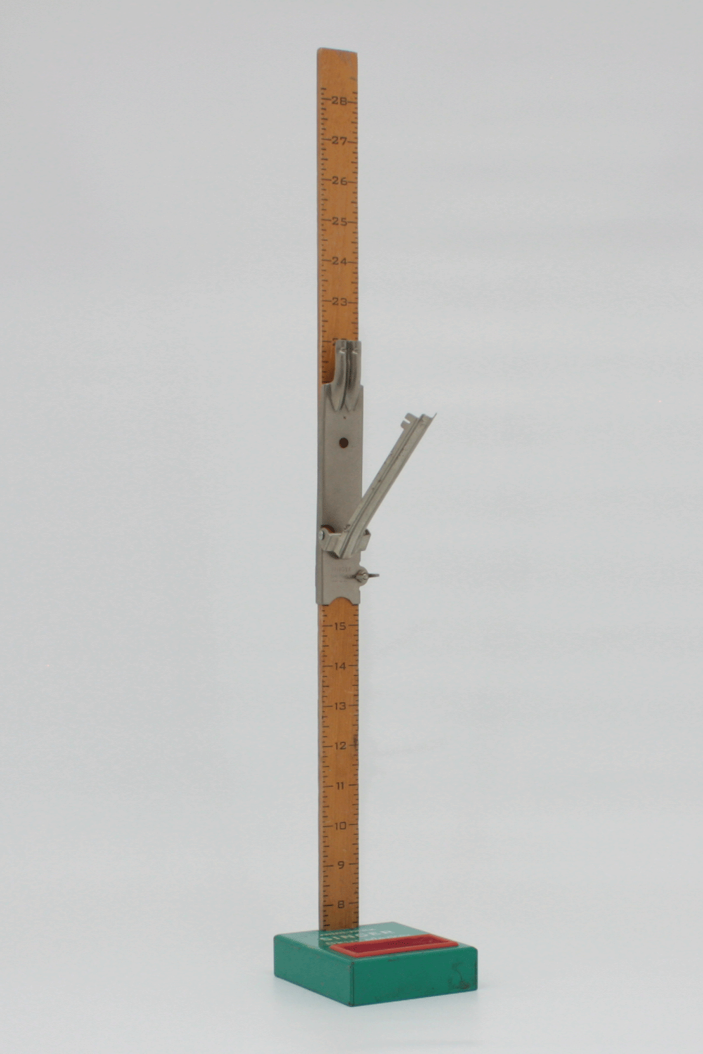 A tailor’s hem marker is basically a measuring stick combined with a chalk sprayer. The idea is simple: it helps you mark a straight, even hemline on garments. You set the desired height on the ruler, position it next to the fabric, and then squeeze the bulb to puff a little chalk onto the material. It’s an easy way to ensure the hem is the same length all the way around.