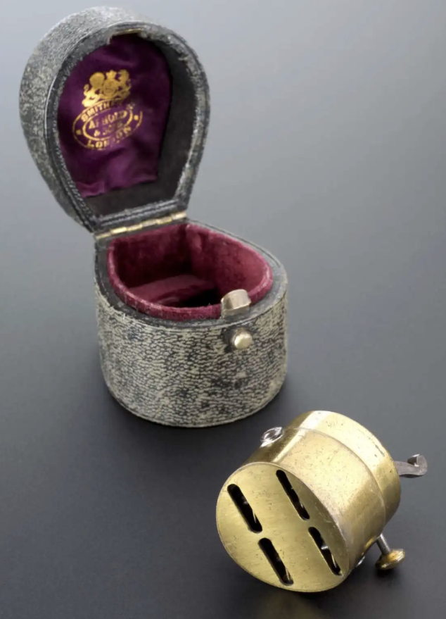 An antique scarificator is a bloodletting instrument designed to create a number of cuts in the patient’s skin at once. When activated, the tool contained spring loaded blades that opened outward and then rapidly returned. Small object with unpleasant intent.