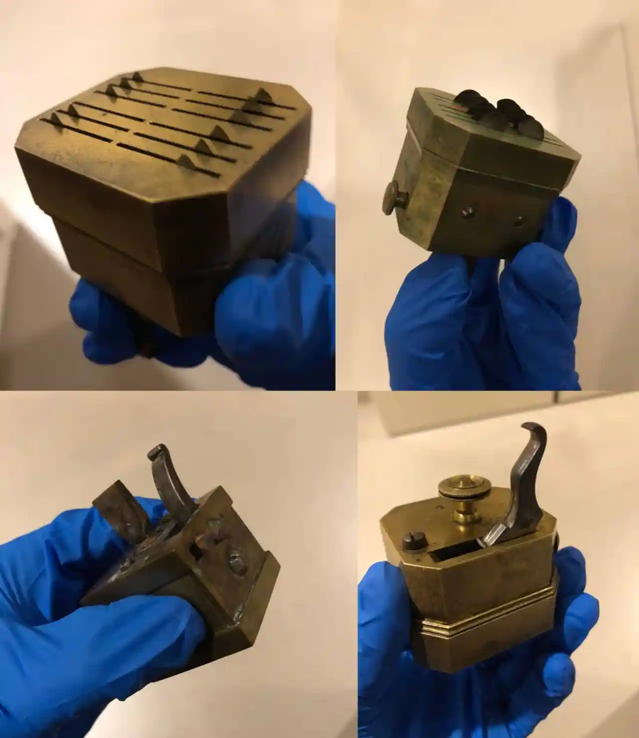 Therefore, the above described unusual brass object is an antique scarificator: an early medical device utilizing bloodletting techniques consisting of a spring-loaded set of blades capable of making a variety of small cuts simultaneously. It is cleverly designed, disturbing and impossible to forget.