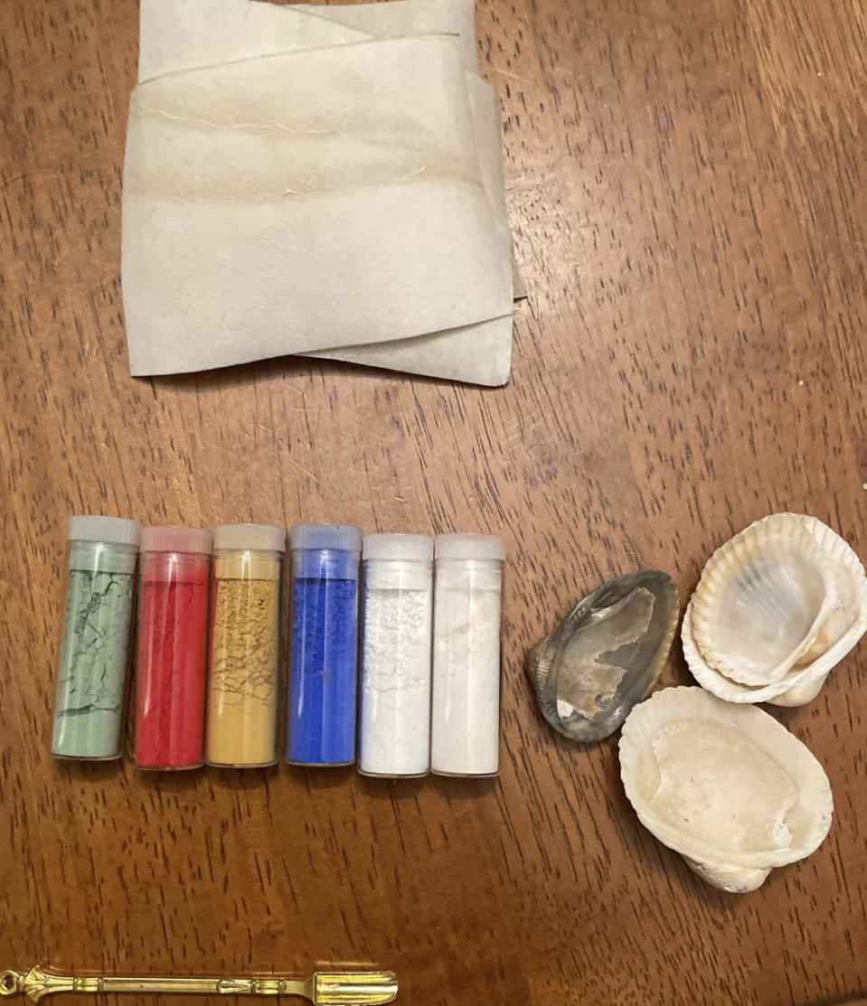 Before the art stores were filled with tubes of paint artists would have to prepare their own pigments using various substances from the natural environment. The green colour might have been created from ground malachite whilst red was obtained from cinnabar or ochre. Such powders were kept in small containers such as shells so as to easily have access to them. When it was time to paint, the artist would then take some pigment, add a binder such as gum arabic and there was the paint.
