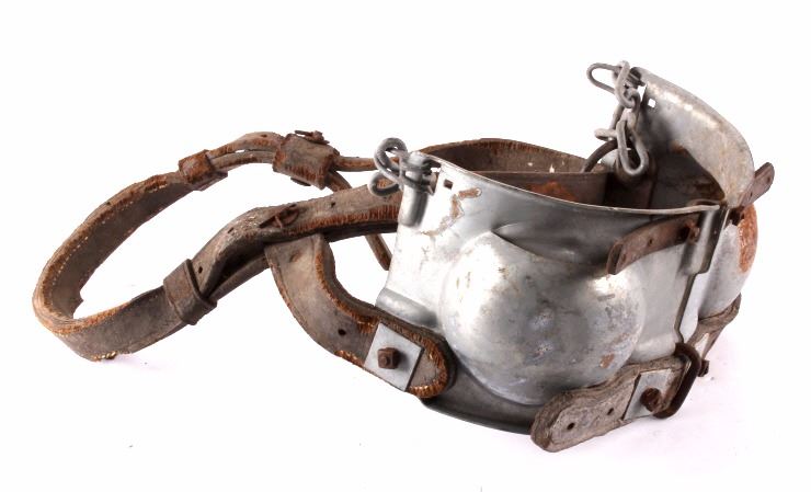 Thick leather collar. Metal eye shields. Chains and straps: to keep everything from flying away. This intensity of design made sense for the job, however. The horse could only see far enough to take a step forward but nothing else.