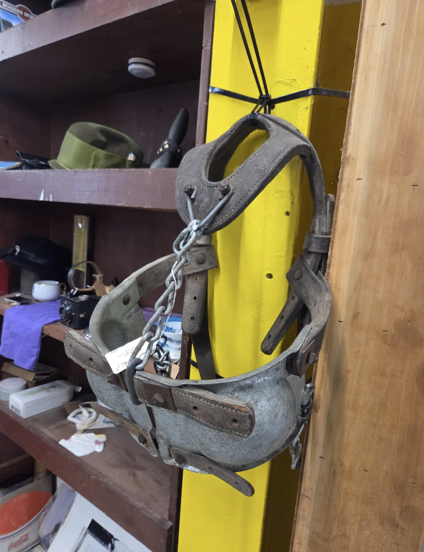 Not your run of the mill carriage blinders. These are industrial, these are clunky, with large metal cups that would have been placed over what used to be a horse’s eyes.” They’re constructed to obstruct everything except a narrow cone of vision.