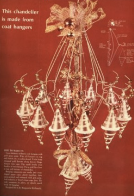 It wasn’t some type of bizarre attic contraption at all. This was a handmade Christmas Chandelier for the attic made from wire clothes hangers. The flat parts were connected via wiring, and the hooks were pointing outwards from the connections. Various ornaments were attached to these hooks. In the middle of the entire thing, was angel hair. And after connecting everything and attaching a hook to hang it from the ceiling; this entire unit was decorated for Christmas.