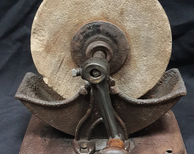 I was riffling through a pile of rusted wrenches when I noticed it. Just sitting there, on a table, like it had waited for someone to recall what it was: a hand-cranked whetstone. A big, stone wheel, cast-iron base, and crank that had not turned for decades.