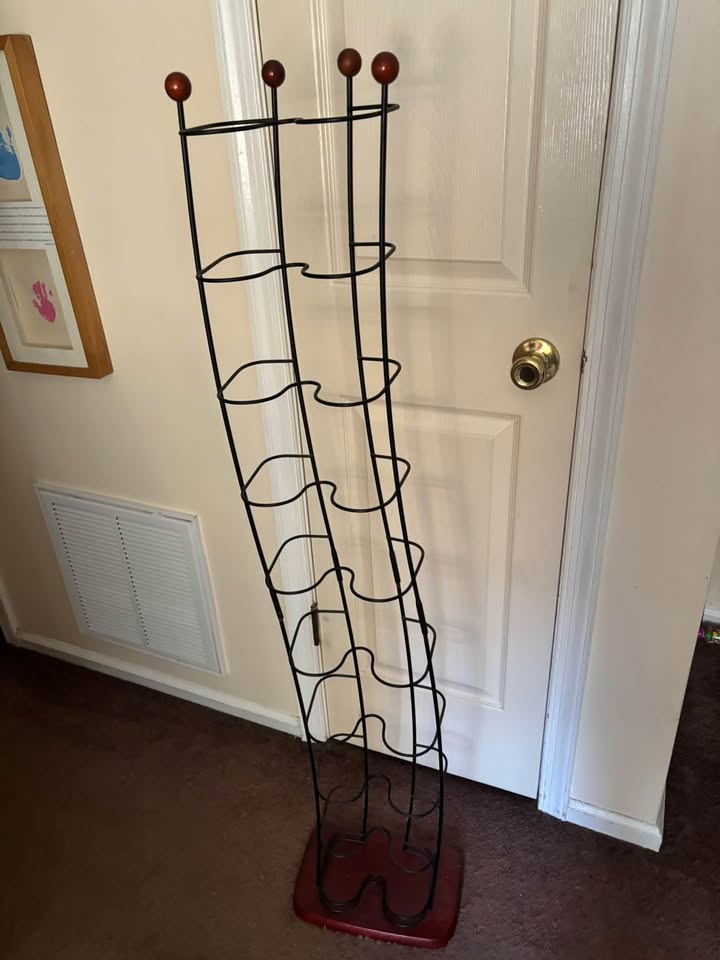 This tall, wobbly wire thing I found at a thrift store last weekend. Black frame, curvy shape — seemed slightly artsy. Thought it was a wine rack. Spoiler: it wasn’t. I jammed a bottle of white into one of the slots and almost broke my foot when it shot out.