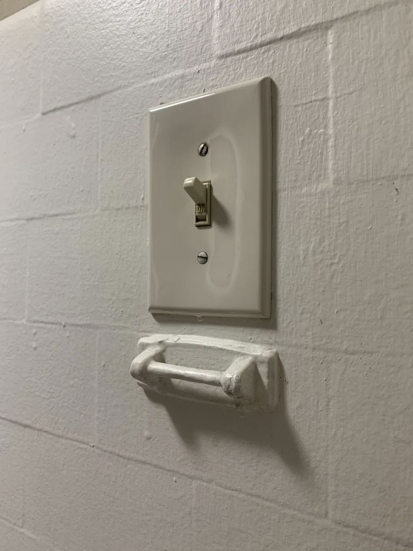 Older homes (early 1900s to 1940s) sometimes have small metal or ceramic hooks on bathroom walls, which may have been used as a shaving strop hook, although they are too small for towels and somewhat awkwardly located for toilet paper.