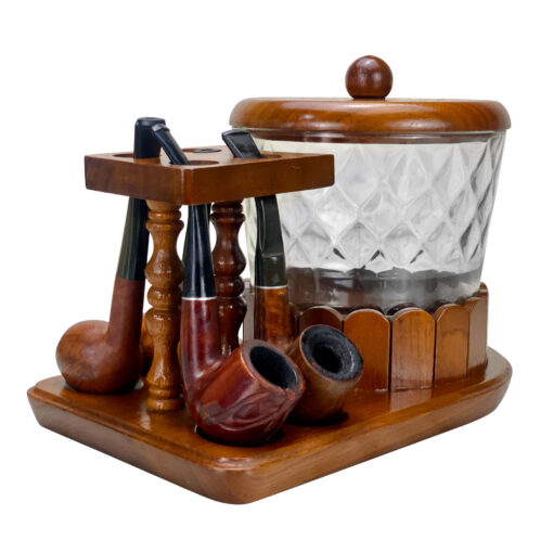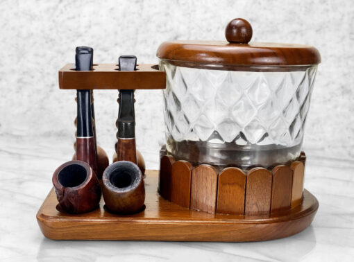 But let’s talk realistically about the looks. It’s got a gimmick that’s a little smart, indeed. The top has compartments or holes by which pipes are held upright, stems up, bowls down. The base has compartments or little curves, or pockets, to hold the bowls securely. Oh yes. The same compartments hold the bowls silently, no tipping over and no spilling of ashes. The glass jar has a considerable and heavy top lid. But usually has inside it a little weight to hold the jar and hold depending on your ambient humidity. This versatility makes the vintage walnut pipe holder a unique addition to any home.