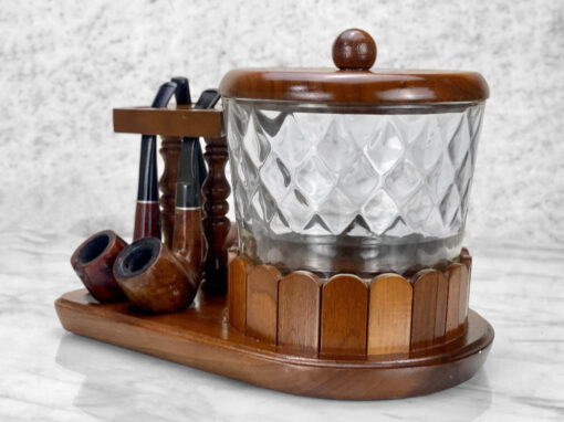 Let me tell you about this item I found buried in a box at my grandfather’s house many years ago. A vintage walnut pipe holder with a glass humidor—I didn’t know that was what it was at the time, I thought it looked like, “Hey, here’s a cool little wooden holder with a jar in it—maybe it’s for peanuts?” Discovering it as a vintage walnut pipe holder was a revelation.