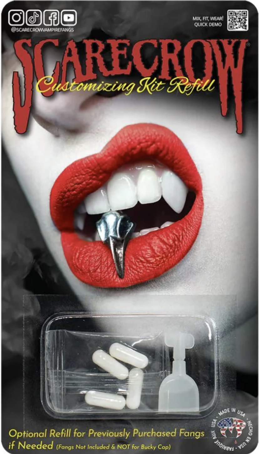 Unlike the oversized plastic vampire teeth, the Scarecrow fangs fit customized. Each kit includes white powder capsules, and a plastic vial that contains bonding liquid made for single use only. Mix the two together, you create a moldable substance that will set to the shape of your tooth and holds the fang on tight. Scarecrow fang kit liquid is essential in ensuring the perfect fit.
